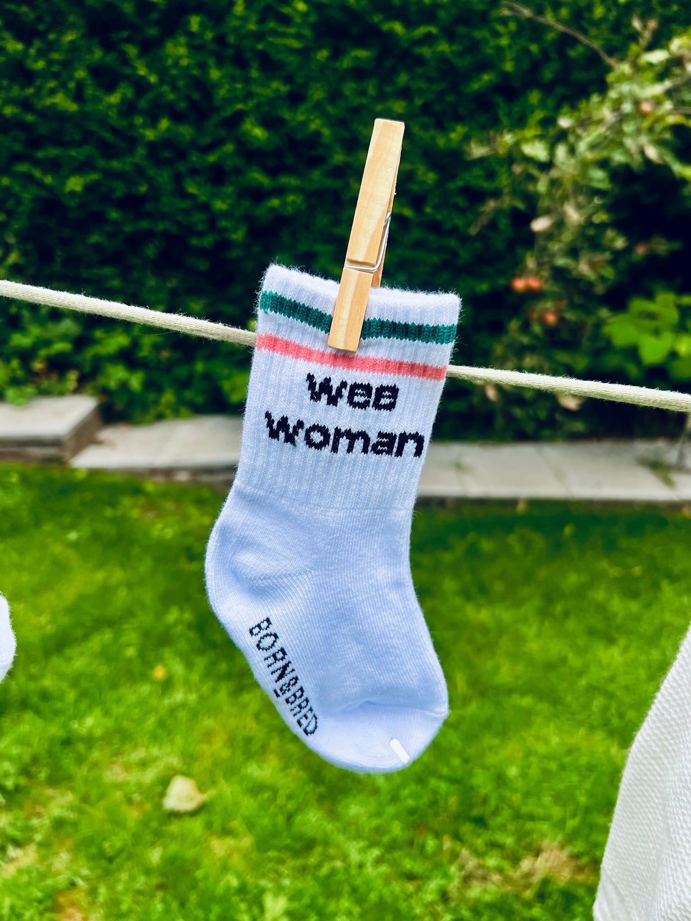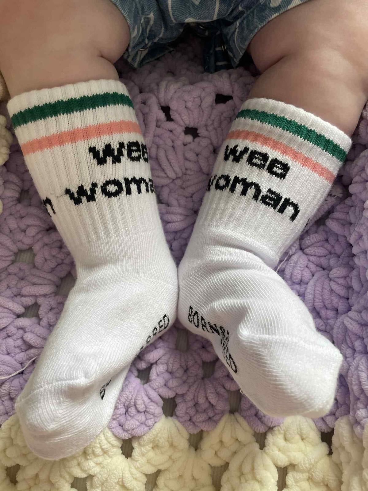 These adorable wee woman baby socks are bound to be a favourite for your little one! Featuring a white base with green and pink stripes at the top, they have a fun message on each side to make slipping them onto tiny feet quick and easy.
