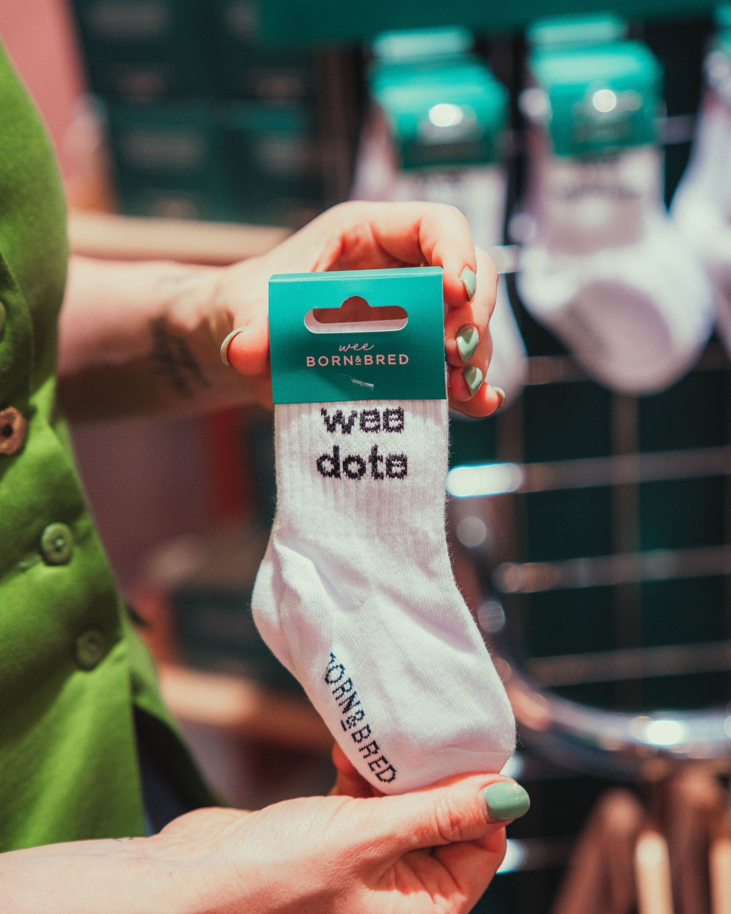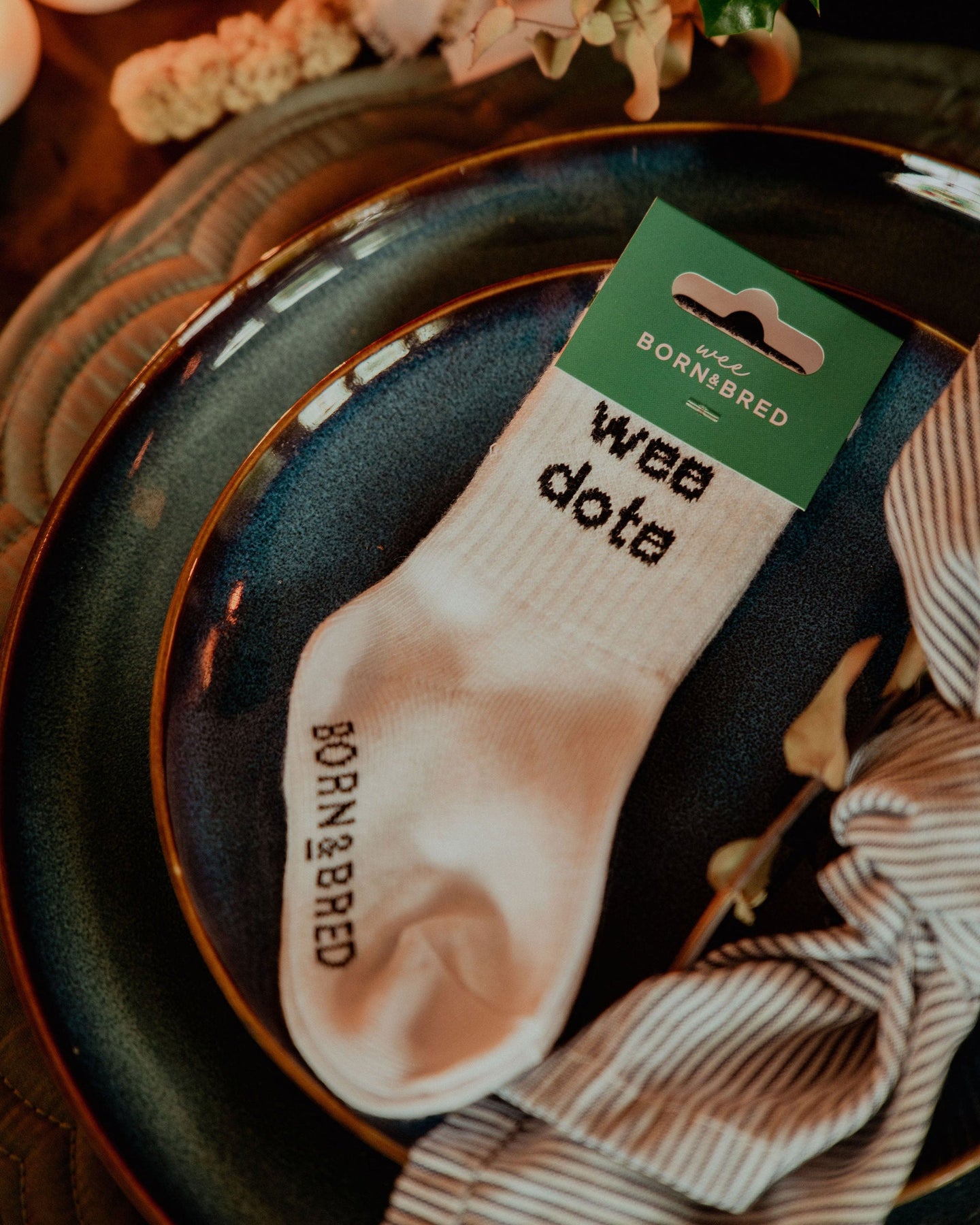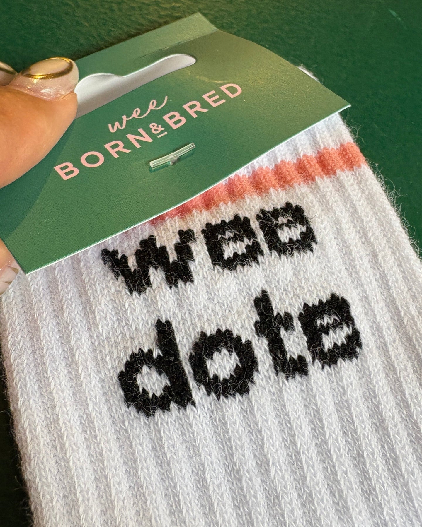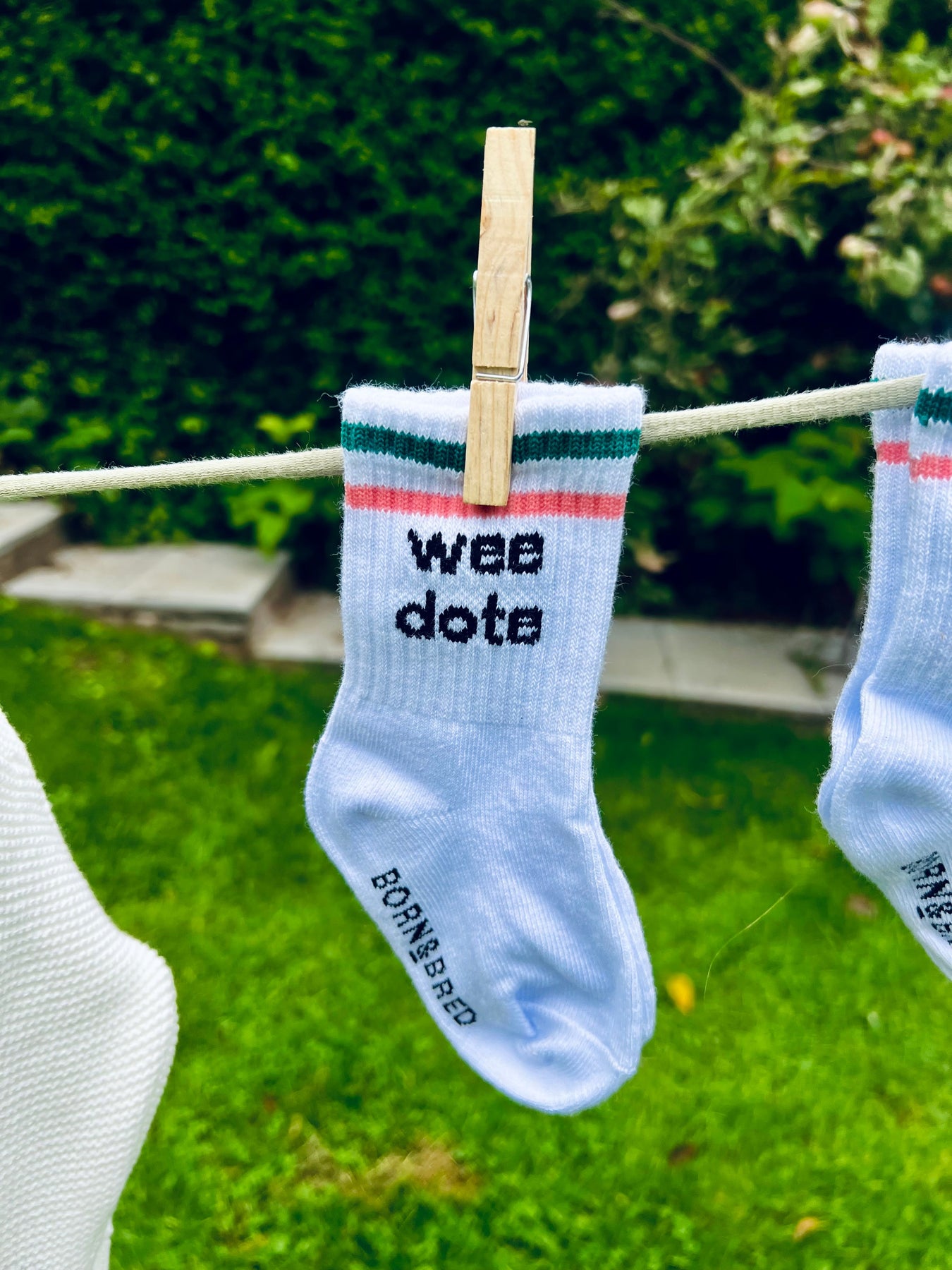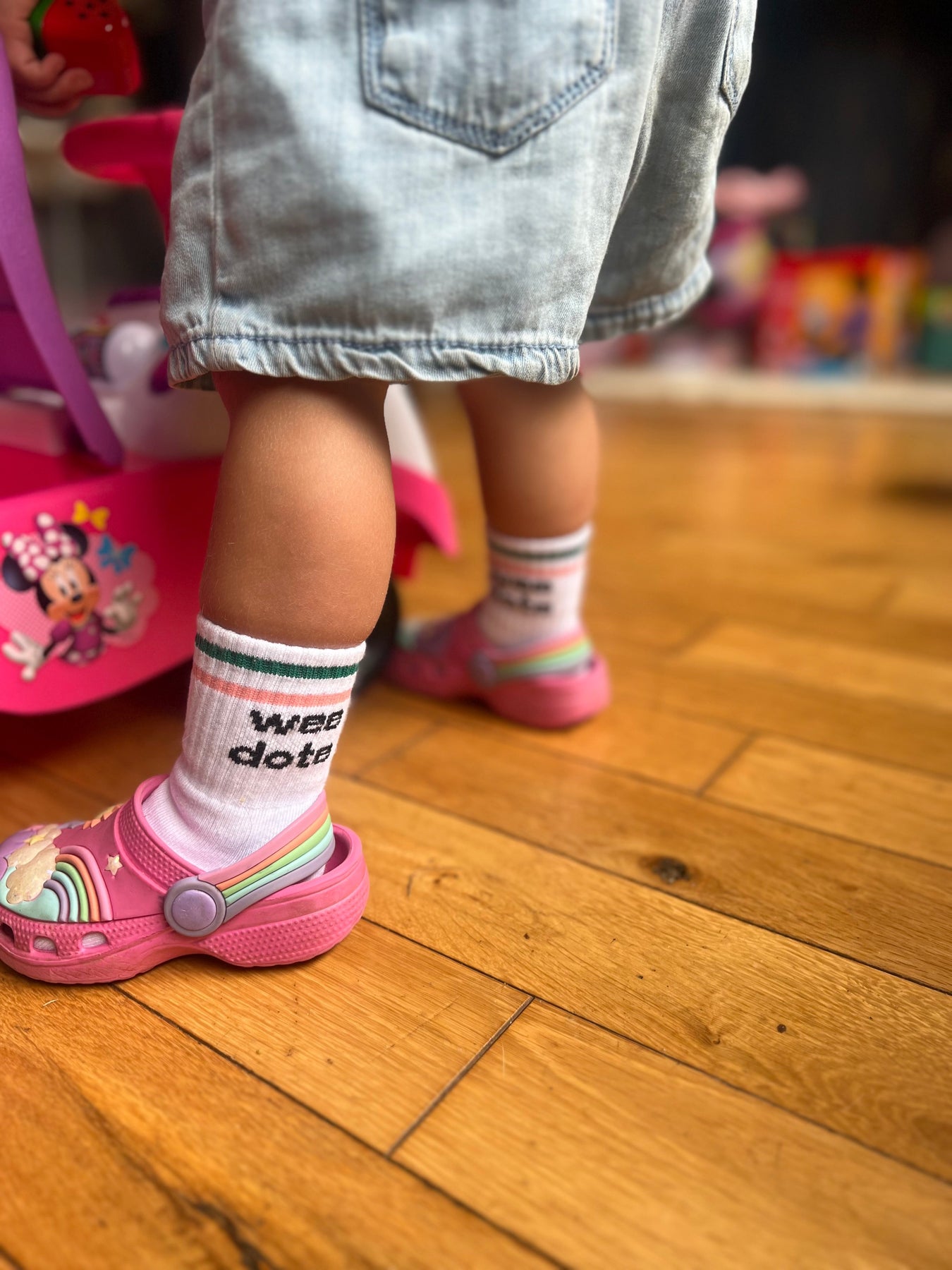 These adorable wee dote baby socks are bound to be a favourite for your little one! Featuring a white base with green and pink stripes at the top, they have a fun message on each side to make slipping them onto tiny feet quick and easy.