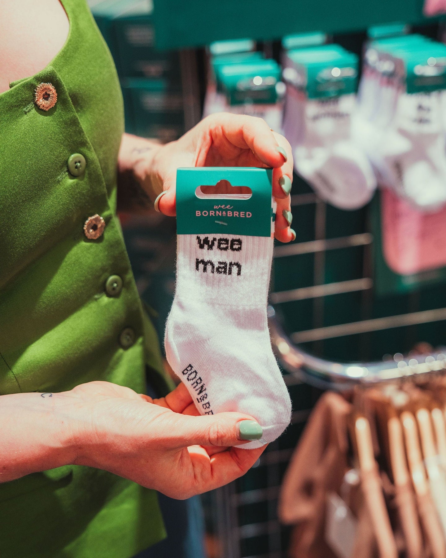 These adorable wee man baby socks are bound to be a favourite for your little one! Featuring a white base with green and pink stripes at the top, they have a fun message on each side to make slipping them onto tiny feet quick and easy.