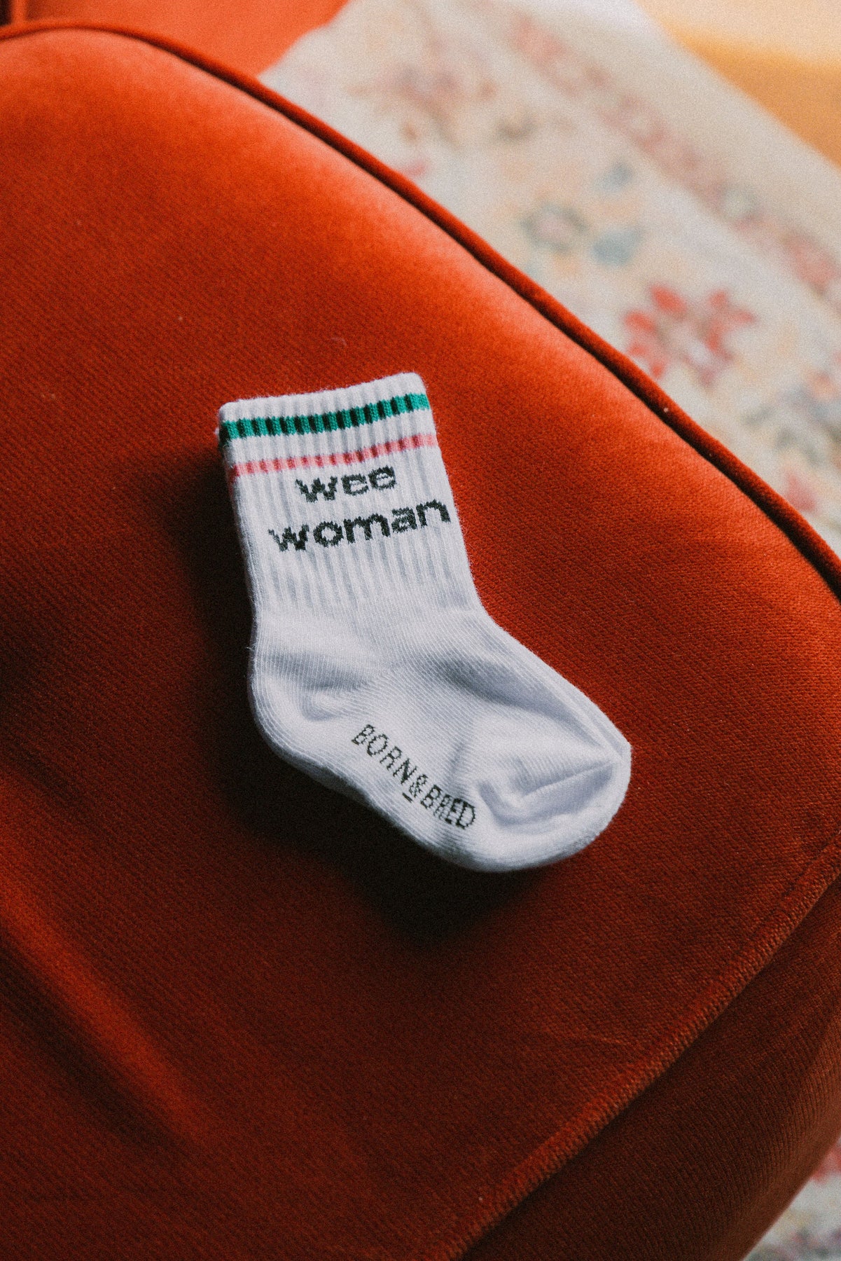 These adorable wee woman baby socks are bound to be a favourite for your little one! Featuring a white base with green and pink stripes at the top, they have a fun message on each side to make slipping them onto tiny feet quick and easy.